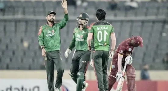 জবাবে ব্যাট হাতে নেমেই চাপে পড়ে যায় উইন্ডিজ। নাসুম আহমেদ একাই ধ্বংস করেন টপ অর্ডার—৩ উইকেট তুলে নেন দারুণ স্পেলে। এরপর রিশাদ ও তানভীরের স্পিনে ধসে পড়ে সফরকারীরা। মাত্র ১১৭ রানে অলআউট হয় তারা।